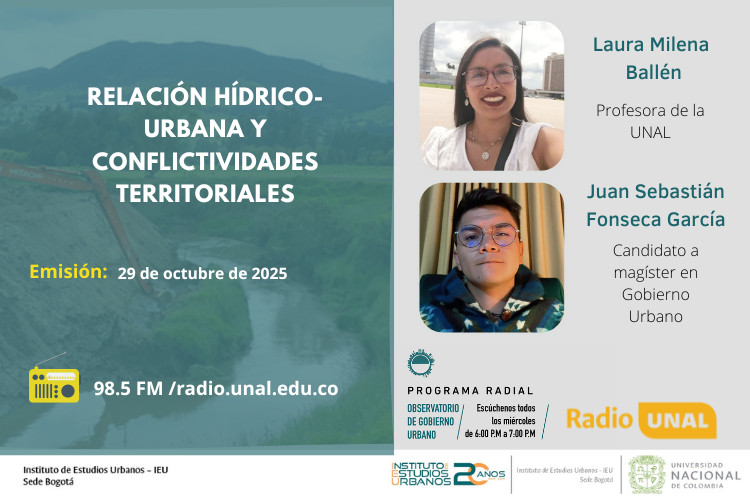 La Maestría en Gobierno Urbano del Instituto de Estudios Urbanos de la Universidad Nacional de Colombia, sede Bogotá, presentó la sustentación del Trabajo Final de Maestría de Juan Sebastián Fonseca García. Su trabajo se titula: “Relación hídrico-urbana y conflictividades territoriales en la expansión urbana de Zipaquirá: incidencia del Plan de Ordenamiento Territorial 2000-2024”.
