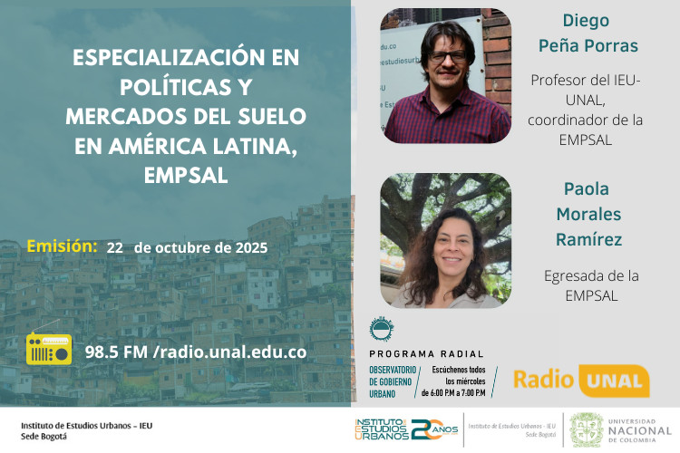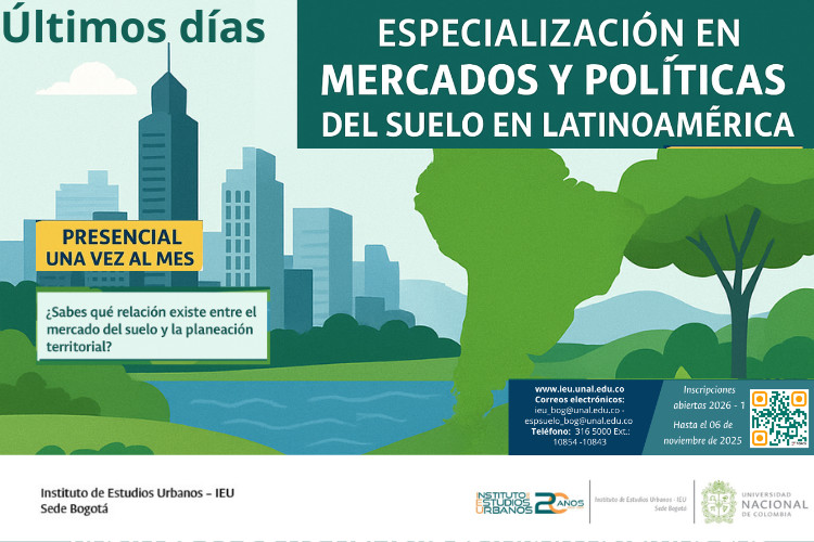 Hasta el próximo 06 de noviembre estarán abiertas las inscripciones para el periodo académico 2026-I de la Especialización en Mercados y Políticas de Suelo en América Latina, gestionada académicamente por el Instituto de Estudios Urbanos de la Universidad Nacional de Colombia, Sede Bogotá.