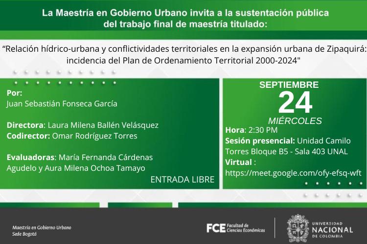 La Maestría en Gobierno Urbano del Instituto de Estudios Urbanos de la Universidad Nacional de Colombia, sede Bogotá, presentará hoy 24 de septiembre de 2025 a las 2:30 p.m. la sustentación del Trabajo Final de Maestría de Juan Sebastián Fonseca García.